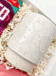 A beautiful white mug adorned with a unique ornate pattern. Makes sipping that morning brew a little more lovely!